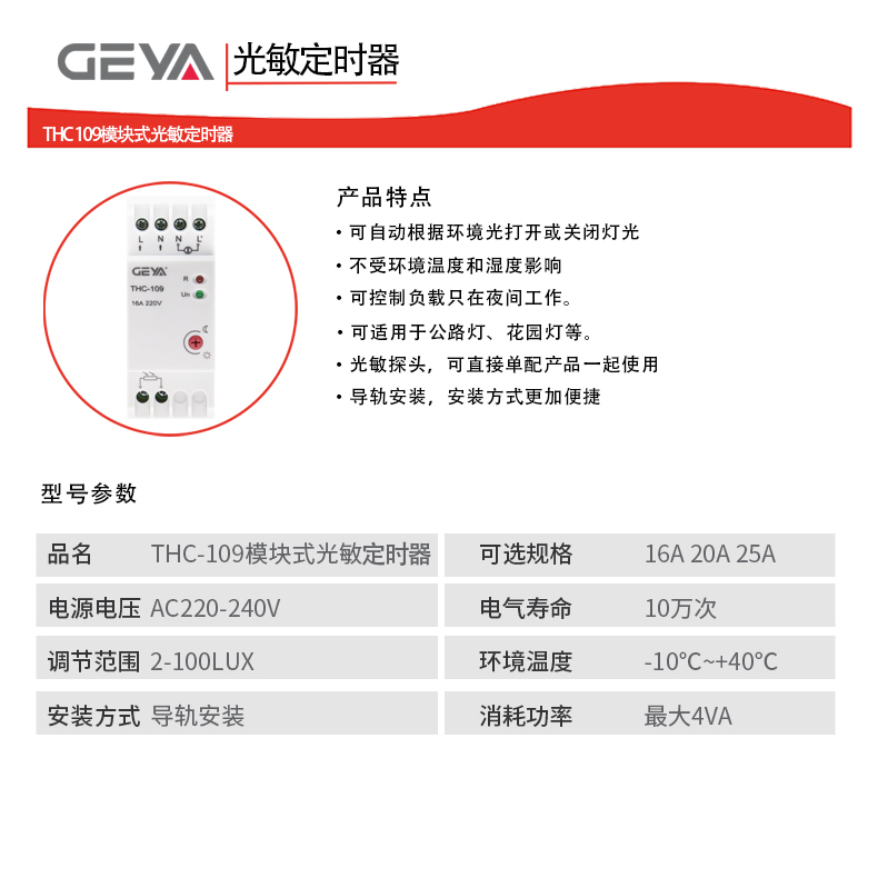 產品介紹:THC 109模塊式光敏感應器不僅方便而且實用,它可以自動根據環境光打開或關閉燈光,也可以控制負載只在夜間工作。不受環境溫度和濕度影響,適用于公路燈、花園燈等。